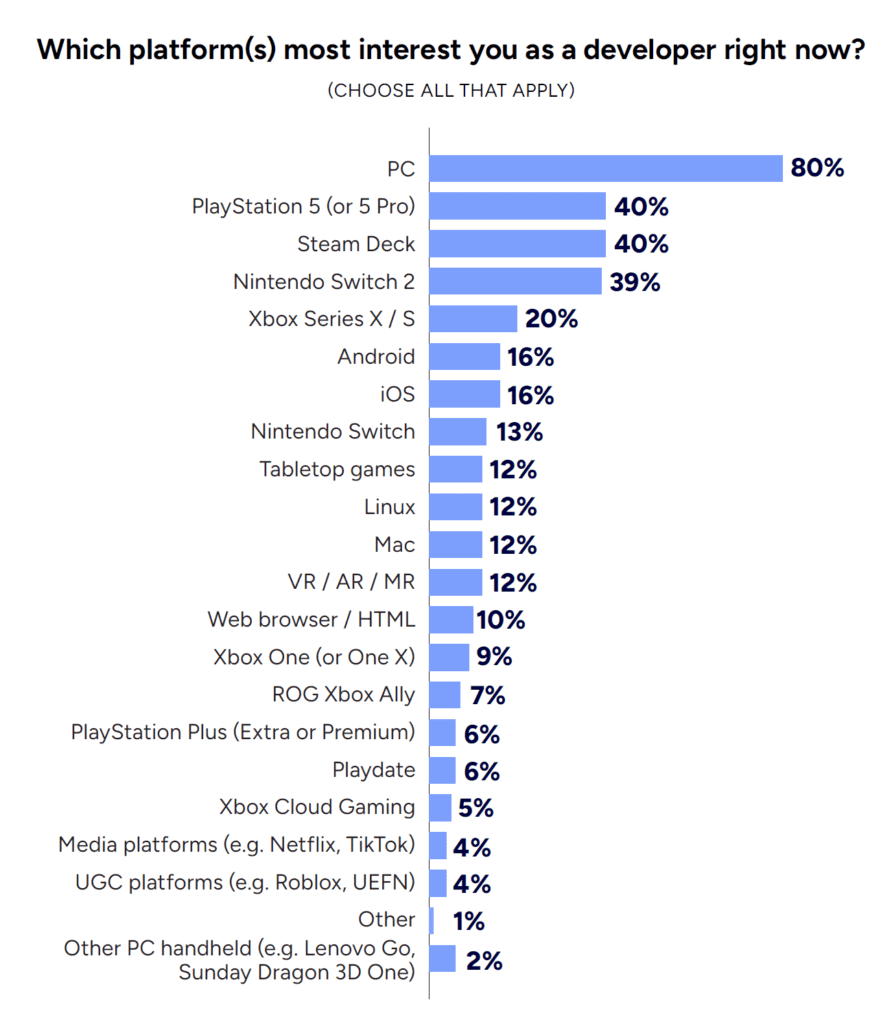 Όσον αφορά τις πλατφόρμες, το PC παραμένει ο βασιλιάς στις προτιμήσεις των developers. Ωστόσο, το Steam Deck έχει αναδειχθεί σε ισχυρό παίκτη, όντας η τέταρτη πιο δημοφιλής πλατφόρμα ανάπτυξης με ποσοστό 28%. Η φορητή συσκευή της Valve κοντράρεται πλέον στα ίσα με το επερχόμενο Nintendo Switch 2 σε επίπεδο ενδιαφέροντος. Αν και νέα πλατφόρμα, συγκεντρώνει ήδη το ενδιαφέρον του 39% των δημιουργών. Το ποσοστό αυτό το τοποθετεί οριακά πίσω από το PS5. Αντίθετα, οι κονσόλες Xbox Series X/S βρίσκονται χαμηλότερα στις προτιμήσεις, με ποσοστό 20%.
