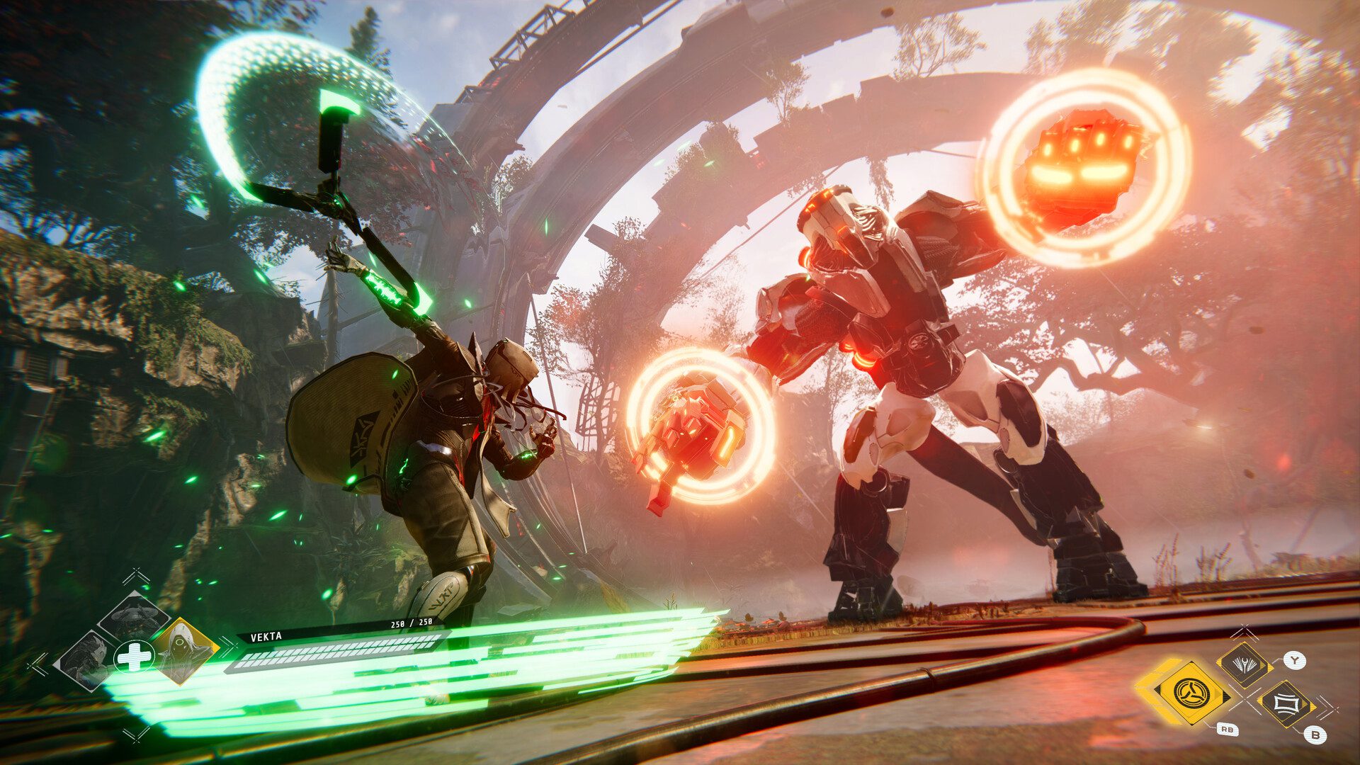 Ο κόσμος του παιχνιδιού, αν και δεν έχει κάποια αφήγηση μέσα από cutscenes, χτίζει το υπόβαθρό του μέσω του περιβάλλοντος. Περιοχές όπως το Steel Sanctuary και το κεντρικό hub αποτυπώνουν μια κατεστραμμένη κοινωνία, με μεταλλικά ερείπια και βιομηχανικά τοπία. Είναι ένα setting που υπηρετεί το ύφος του παιχνιδιού χωρίς να διακόπτει τον ρυθμό και δίνει την εντύπωση πως πρόκειται για έναν κόσμο σε αποσύνθεση, με τις προσομοιώσεις να προσπαθούν να χτίσουν μια άλλη πραγματικότητα.