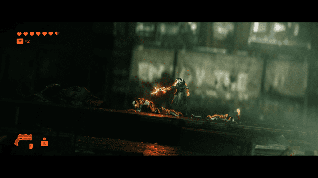 Σε όλα αυτά βοηθάει και η αριστοτεχνική αξιοποίηση της κάμερας με τις μεταβάσεις των σκηνών και την γενικότερη σκηνοθεσία να δημιουργούν μια εμπειρία που θυμίζει κινηματογραφική παραγωγή και μια αίσθηση ενός film noir – ενώ δεν είναι (duh). H αλήθεια είναι πως ο φωτισμός συνδράμει αρκετά στο να εδραιωθεί η Post-apocalyptic Punk αισθητική ενώ παράλληλα βοηθάει και στο να ενωθεί το background με τα pixelated μοντέλα.