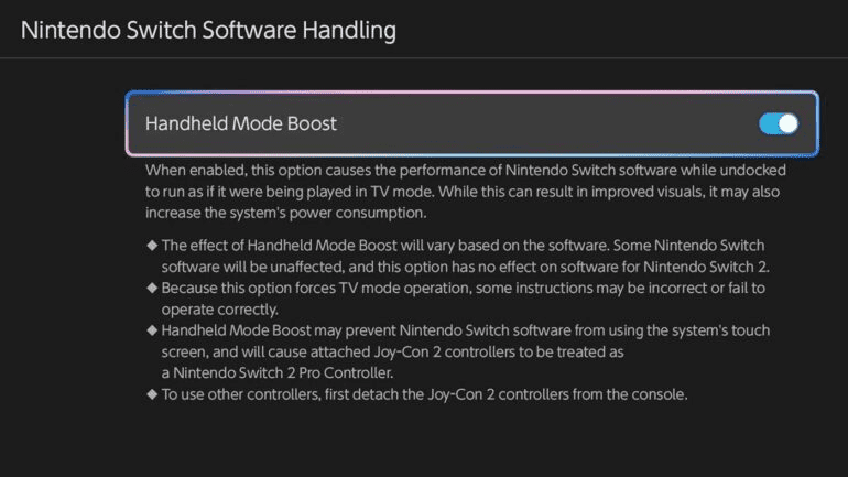 Στο Nintendo Switch 2, η προσθήκη αυτή είναι το Handheld Mode Boost, μια λειτουργία που επιτρέπει σε συμβατά παιχνίδια του Switch να τρέχουν σαν να βρίσκονται σε TV Mode όταν παίζονται σε Handheld Mode. Αυτό πρακτικά σημαίνει ότι για συγκεκριμένα παιχνίδια θα μπορούμε να έχουμε καλύτερη απόδοση ή επιπλέον δυνατότητες κατά το portable gameplay, αν και σε ορισμένες περιπτώσεις ενδέχεται να επηρεάζονται συγκεκριμένα χαρακτηριστικά των τίτλων.